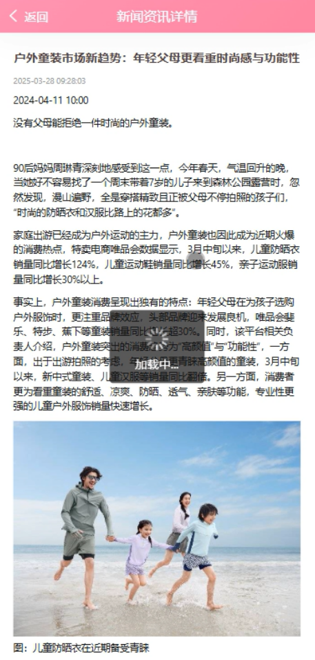 用户可以查看平台发布的新闻资讯,了解最新的童装行业动态、产品推荐和促销活动,提升用户对商城的粘性和信息获取体验。如图5-3所示