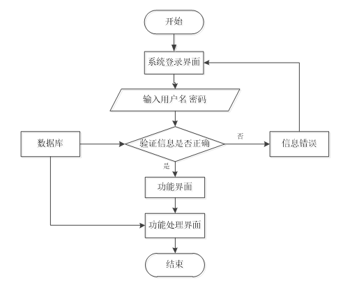 用户从“系统登录界面”开始,输入用户名和密码后,系统验证其信息是否正确。如果验证通过,则进入功能界面并进一步进入功能处理界面,最后流程结束;如果验证失败,则显示“信息错误”,用户需要重新输入。数据库支持验证过程。如图3-3所示。