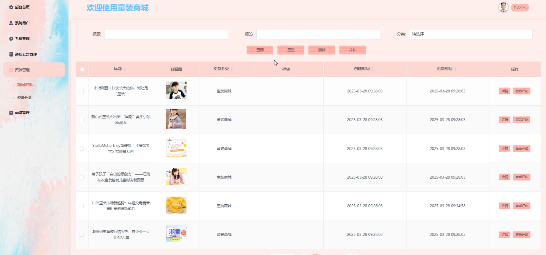 资源管理(新闻资讯、资讯分类):管理员可以管理平台上的新闻资讯内容及其分类,更新与童装行业相关的新闻、文章或产品推荐,增强商城的内容丰富性,吸引更多用户访问。
