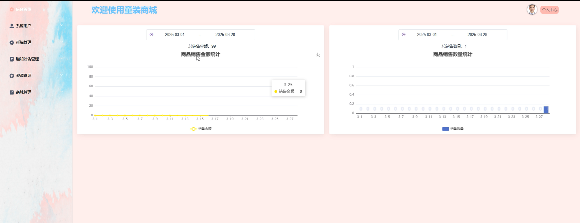 后台首页:管理员通过后台首页可以快速查看商城的整体运营情况,包括订单数量、销售数据、用户活动等关键指标,帮助管理员及时了解系统运行状况,做出调整和优化决策。