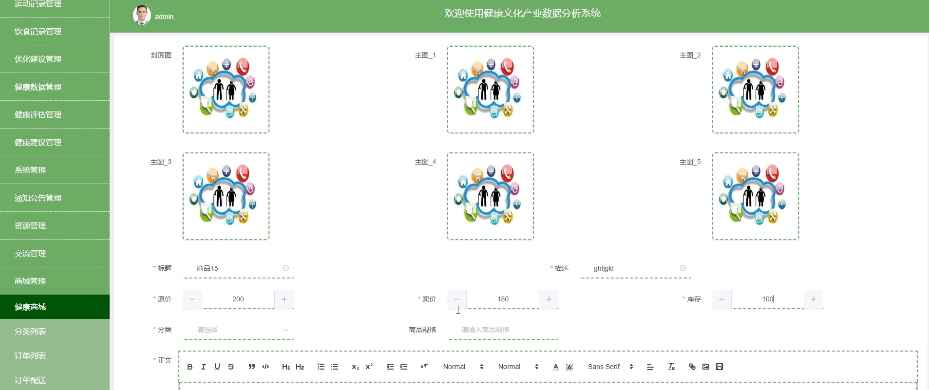 商城管理:管理健康商城的商品信息,包括商品上架、下架、价格调整等。处理订单、物流等问题,保障商城的正常运营。其界面图如下。