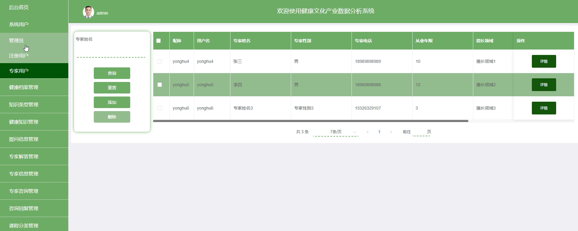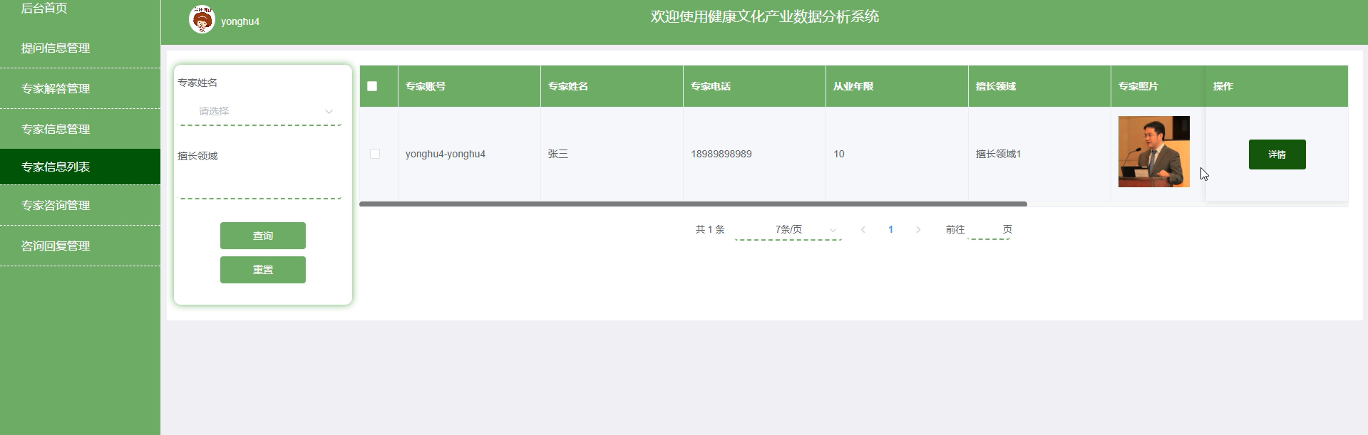 6-3 专家信息搜索 1. 点击专家信息。 显示所有专家信息列表。
