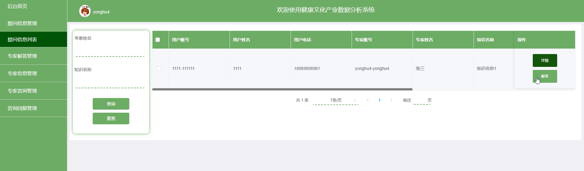 The system is developed using Java language, combined with MySQL database to store data, and has good stability and scalability. The system has designed rich and targeted functions for different user roles, namely registered users, expert users, and administrators. Registered users can perform registration and login, browse health information, participate in community interaction, shop in the health mall, and other operations. The system can also intelligently recommend health knowledge based on user browsing records; Expert users can manage questioning information, expert answers, etc; Administrators are responsible for the comprehensive management of the system, including user management, health record management, knowledge management, etc.