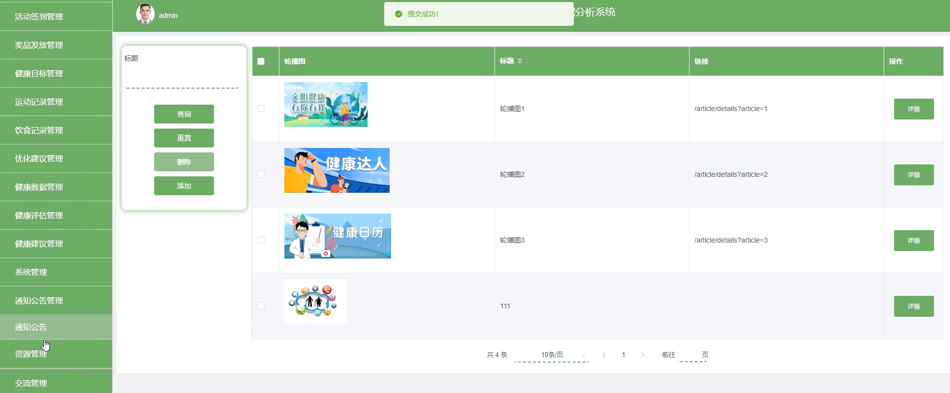在用户健康管理方面,系统为用户提供了便捷的健康数据管理和分析工具。用户可以通过系统记录自己的健康数据,如运动、饮食、睡眠等,并获得个性化的健康建议和指导。这有助于用户更好地了解自己的健康状况,制定合理的健康计划,提高健康水平。