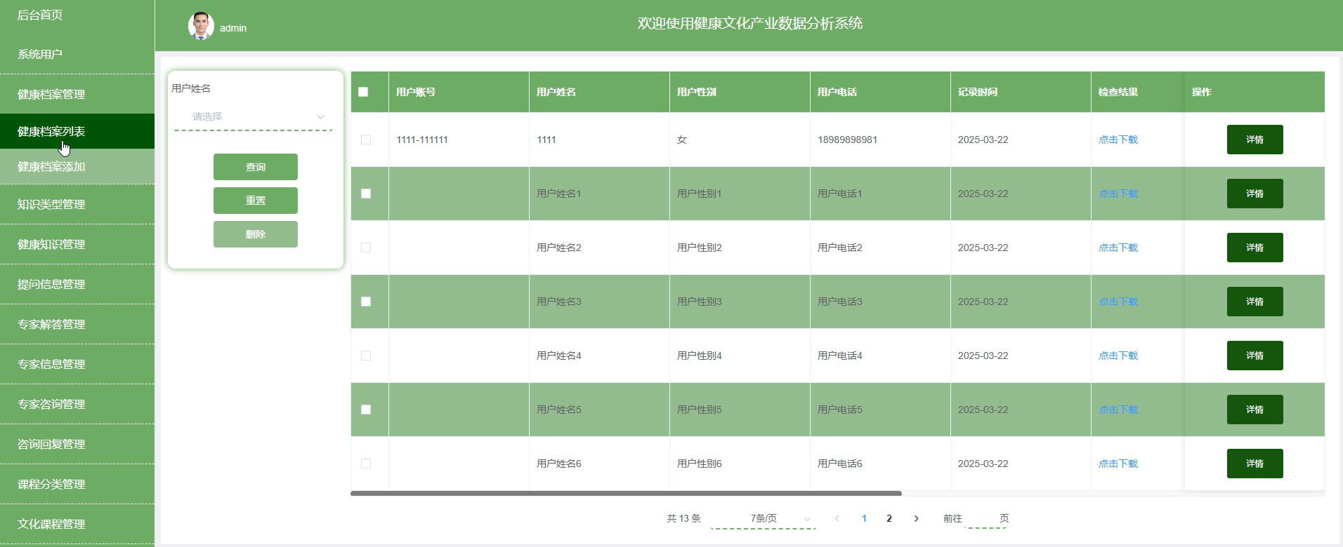 健康档案管理:管理用户的健康档案信息,确保档案的完整性和准确性。可对档案进行分类、检索,方便在需要时快速查询用户的健康状况。其界面图如下。