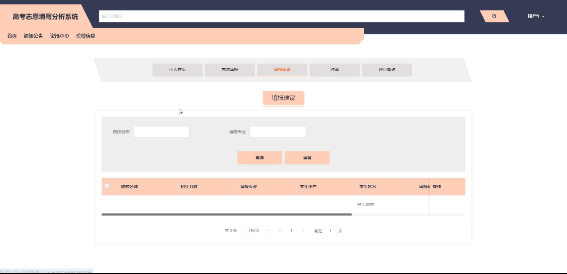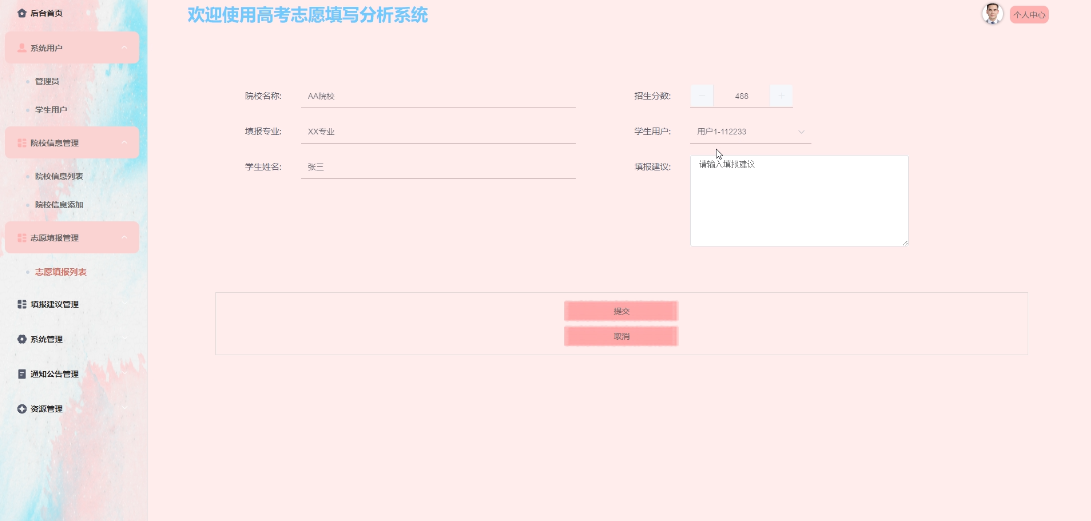 - 填报建议管理:管理员可管理所有填报建议信息,包括查询、更新、删除填报建议,负责更加学生提交的志愿填报信息给予填报建议。