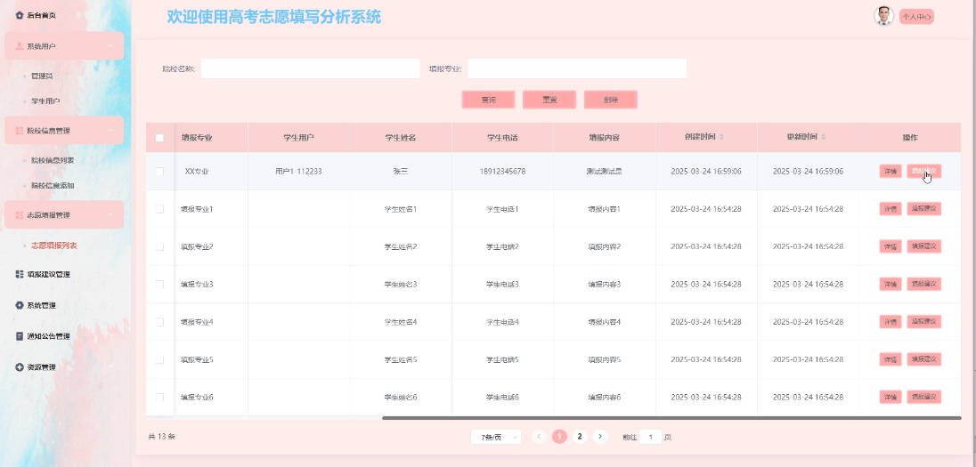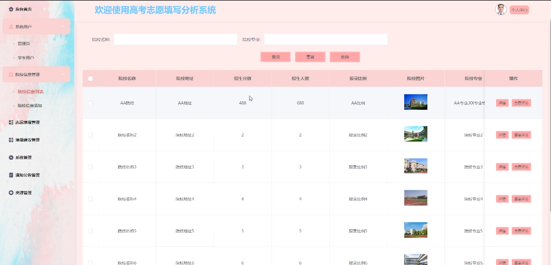 - 志愿填报管理:管理员可管理所有志愿填报信息,包括查询、删除志愿填报,可查阅学生提交的志愿填报详情,提供填报建议操作。