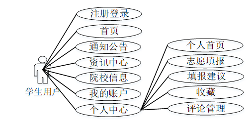 在高考志愿填写分析系统中学生用户包含注册登录、首页、通知公告、资讯中心、院校信息、我的账户、个人中心等功能。学生用户用例图如图3-1所示: