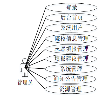 高考志愿填写分析系统中管理员则集成了登录、后台首页、系统用户、院校信息管理、志愿填报管理、填报建议管理、系统管理、通知公告管理、资源管理等功能。管理员用例图如图3-2所示:
