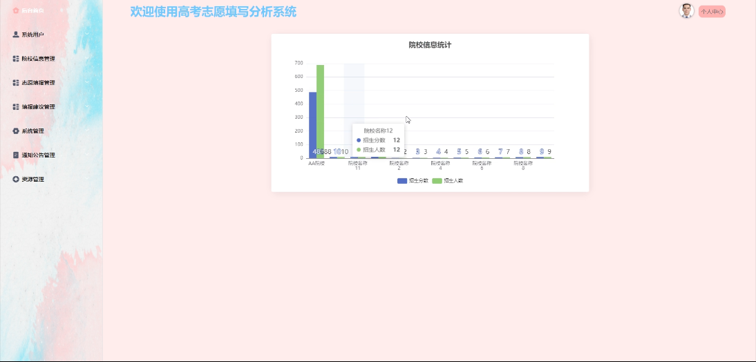 - 后台首页:管理员登录后台的起始界面,该界面主要展示系统重要信息概览,提供数据统计分析图(如院校信息统计)。