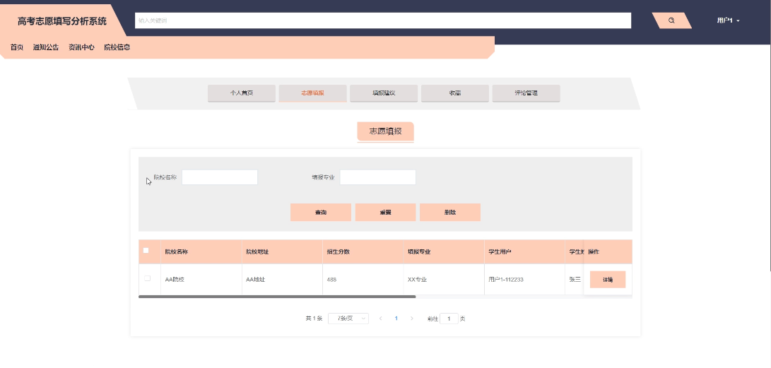 - 院校信息:提供院校信息展示,支持关键字、排序搜索,学生用户可以浏览院校信息,并点赞、收藏和评论院校信息,实现志愿填报功能。