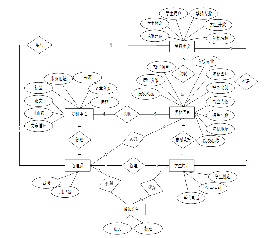 借助系统总体E-R图可以使其他用户快速轻松地了解系统的功能以及他们之间的关系。根据高考志愿填写分析系统各个实体和属性的分析结果,本高考志愿填写分析系统总体E-R实体关系图如图4-2所示。