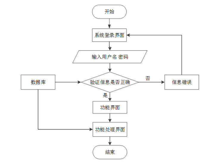 当用户进入登录页面,输入用户名和密码等信息,此时系统将进行基本的输入验证,确认用户名和密码不为空,点击“登录”按钮提交登录请求后,系统将进一步研究用户名和密码是否匹配,验证成功则可成功登录,跳转至用户主界面;反之,提示错误返回登录界面。登录流程图如图3-4所示。