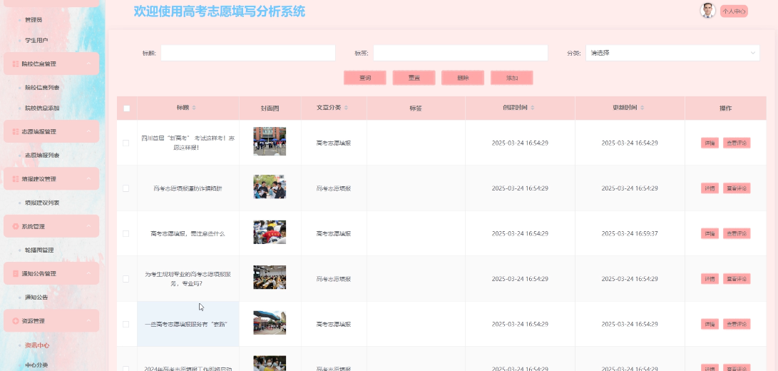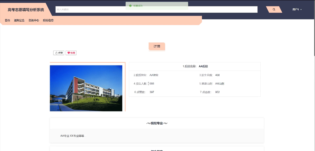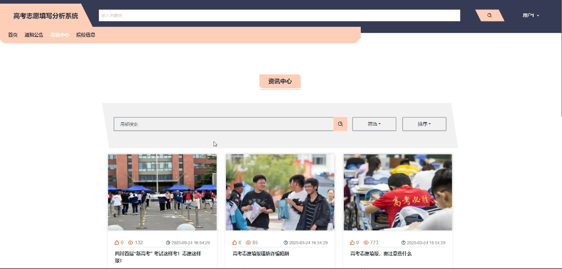 - 资讯中心:提供高校志愿填报的相关新闻、文章展示和热门资讯推荐,让学生用户快速获取最新资讯,支持点赞、收藏、评论资讯中心。