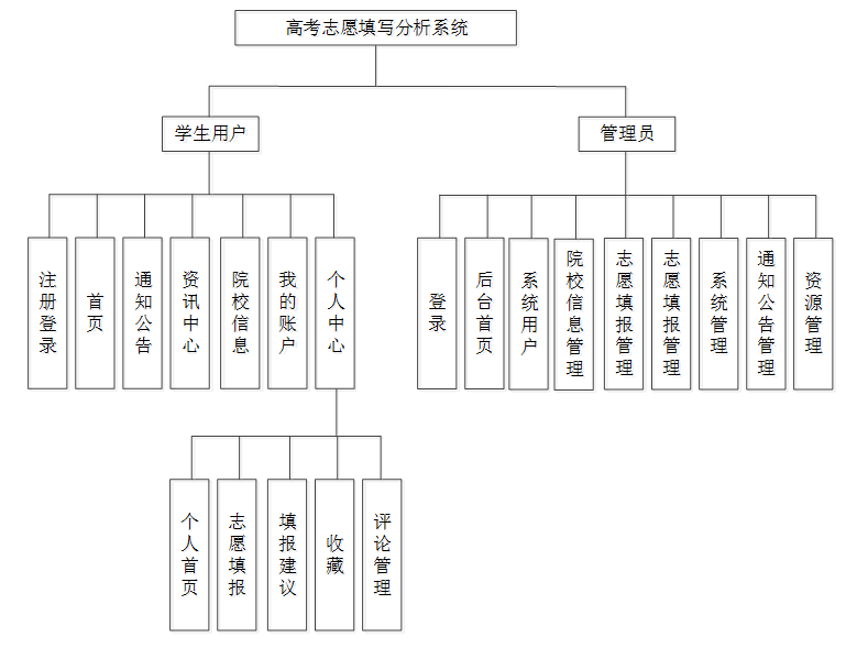 整个高考志愿填写分析系统是由多个功能模块组合而成的,根据用户需求分析,本系统主要可以划分为学生用户和管理员两大模块。各模块又可细分为不同的子功能设计,实现多角色协作,负责不同的职能,每个角色对应的功能模块如图4-1所示。