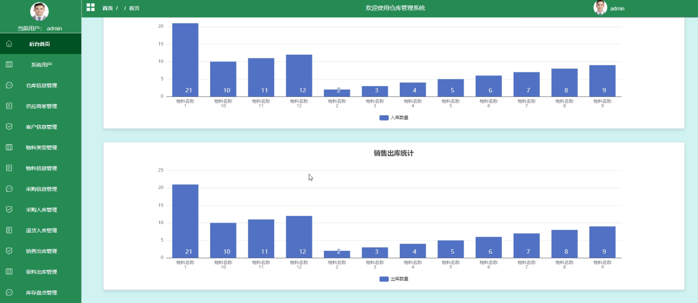 - 后台首页:在后台首页,管理员可以查看个人信息,进行密码修改操作。同时,首页提供了物料信息统计、采购入库统计和销售出库统计的快速入口,方便管理员随时掌握库存和业务情况。