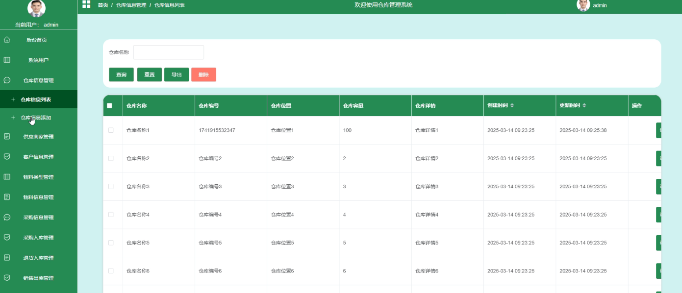 - 仓库信息管理:在仓库信息管理模块,管理员可以进行仓库的添加、删除和查询操作。每个仓库的详细信息也可以查看,包括仓库的位置、容量等关键信息。
