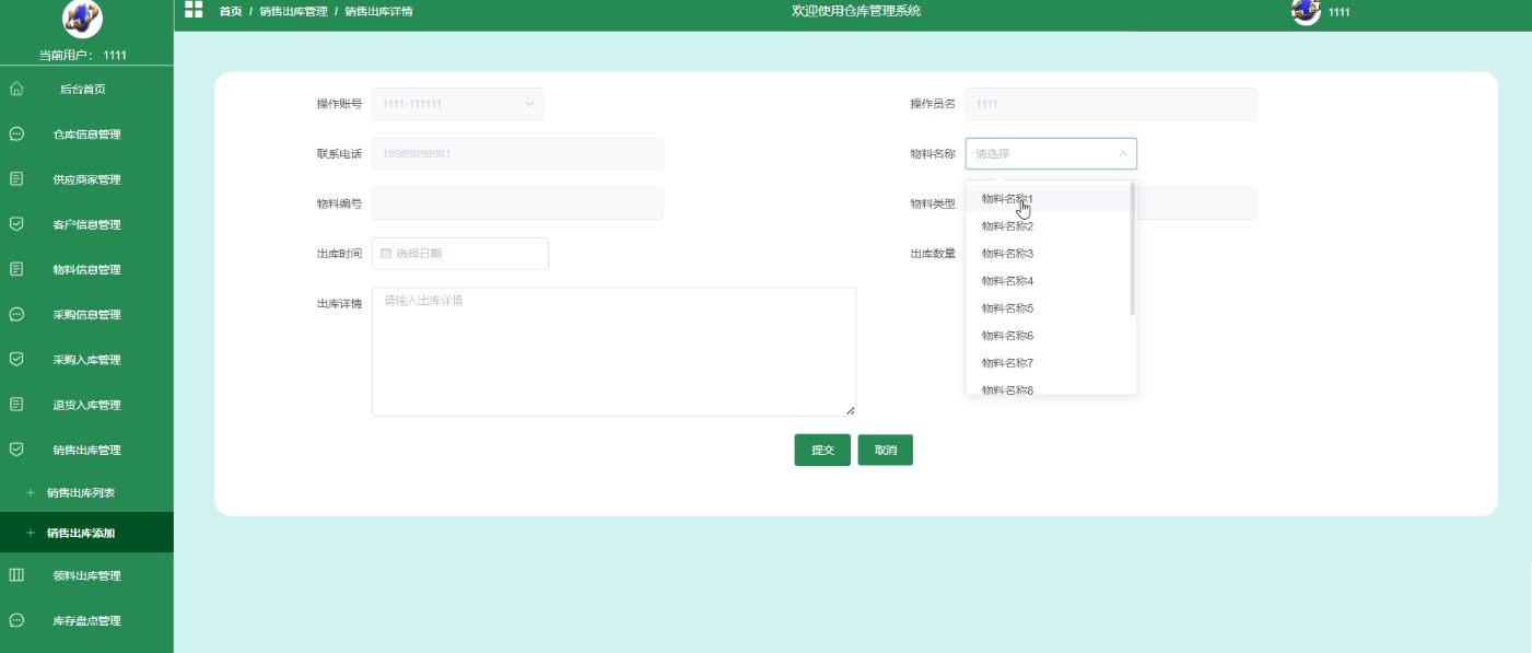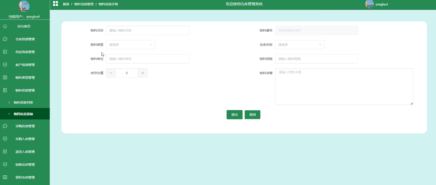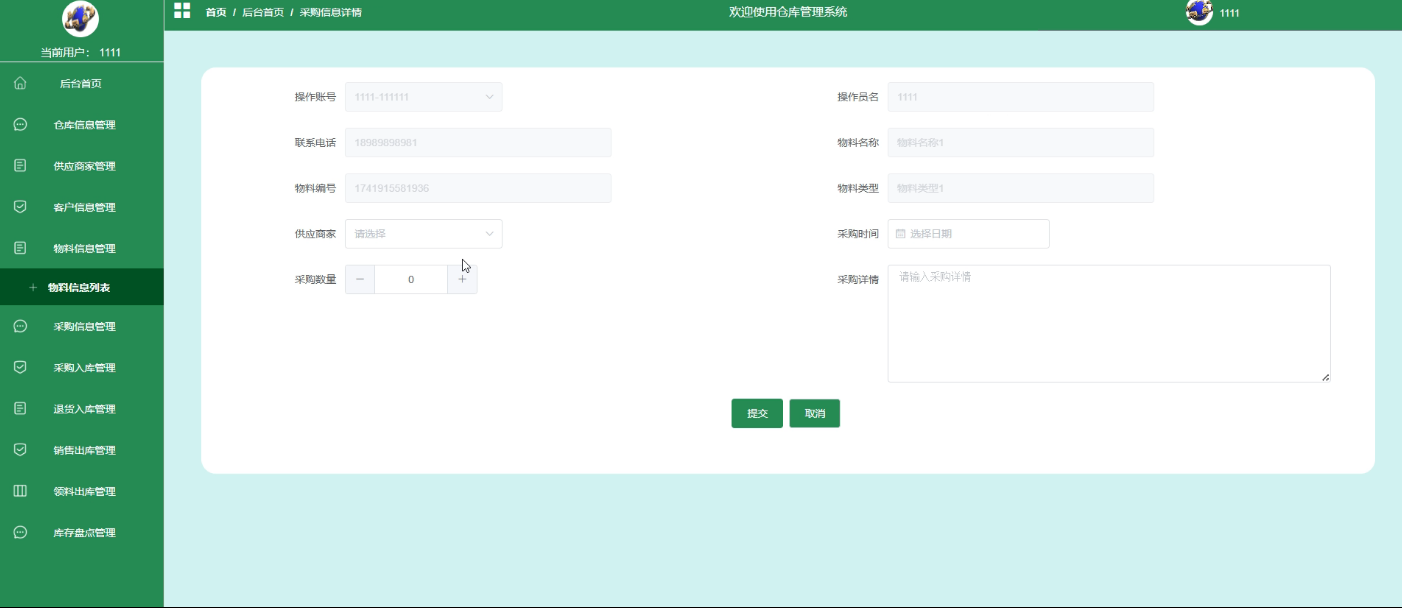 - 后台首页:用户登录后,将进入后台首页,在这里可以查看个人信息,包括用户名、联系方式等。用户还可以在这里修改密码,确保账户的安全。此外,后台首页还提供了物料信息统计功能,方便用户快速了解物料的总体情况。