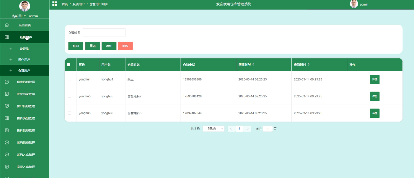 - 系统用户管理:系统用户管理分为操作用户、仓管用户和管理员三个角色。管理员可以添加、删除和查询不同角色的用户信息,并查看每个用户的详细信息,以确保系统的安全和有序管理。
