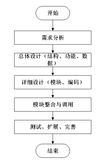 系统开发流程的主要步骤,从需求分析到系统完成的全过程。流程包括需求分析、总体设计(结构、功能、数据)、详细设计(模块、编码)、模块整合与调用,以及测试、扩展和完善,最终完成系统的开发。本系统的开发流程如下图所示