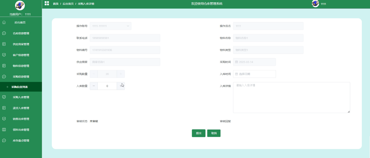 - 采购入库管理:用户可以在此模块中查询采购入库的相关信息,包括入库的物料名称、数量、入库时间等。点击查询结果,用户可以查看入库信息的详细情况,并进行审核操作,确保入库流程的准确性。