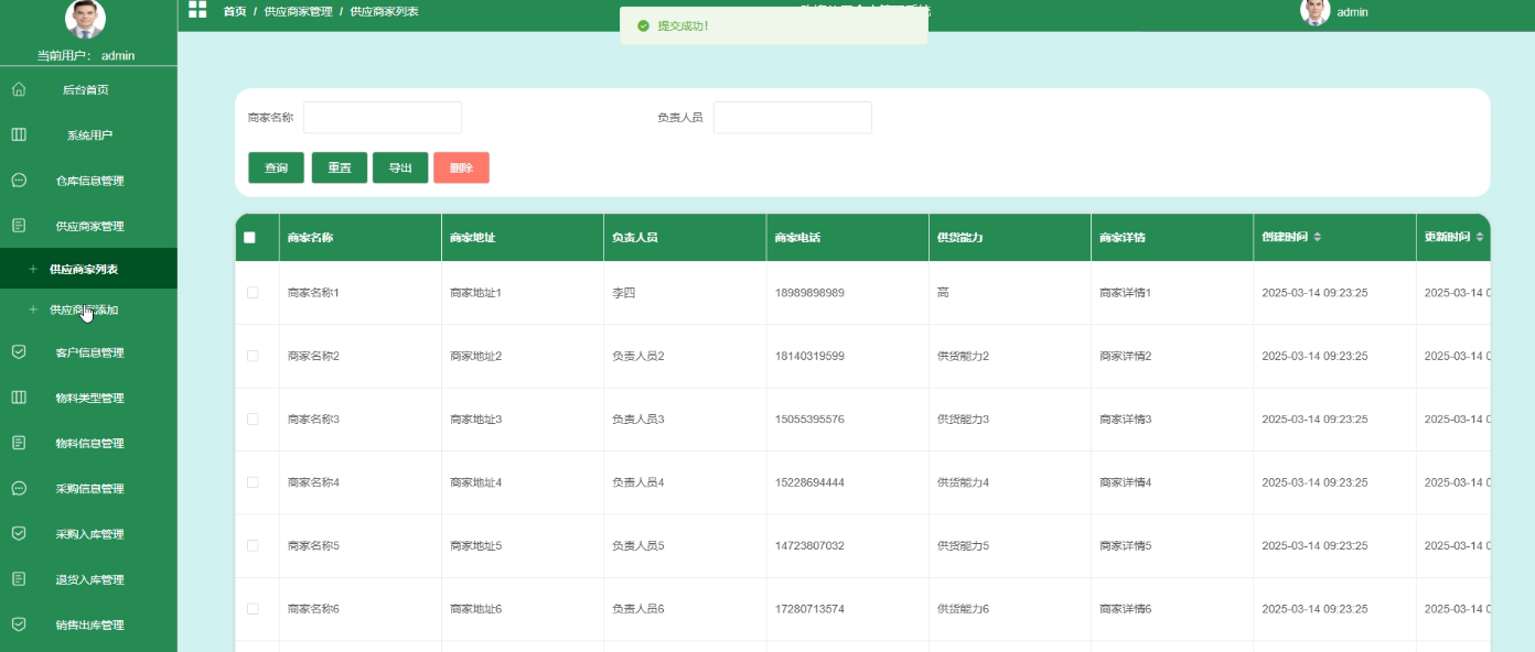 - 采购信息管理:采购信息管理模块提供了删除、查询和导出采购信息的功能。管理员可以通过这些操作,对采购历史进行追踪和分析。