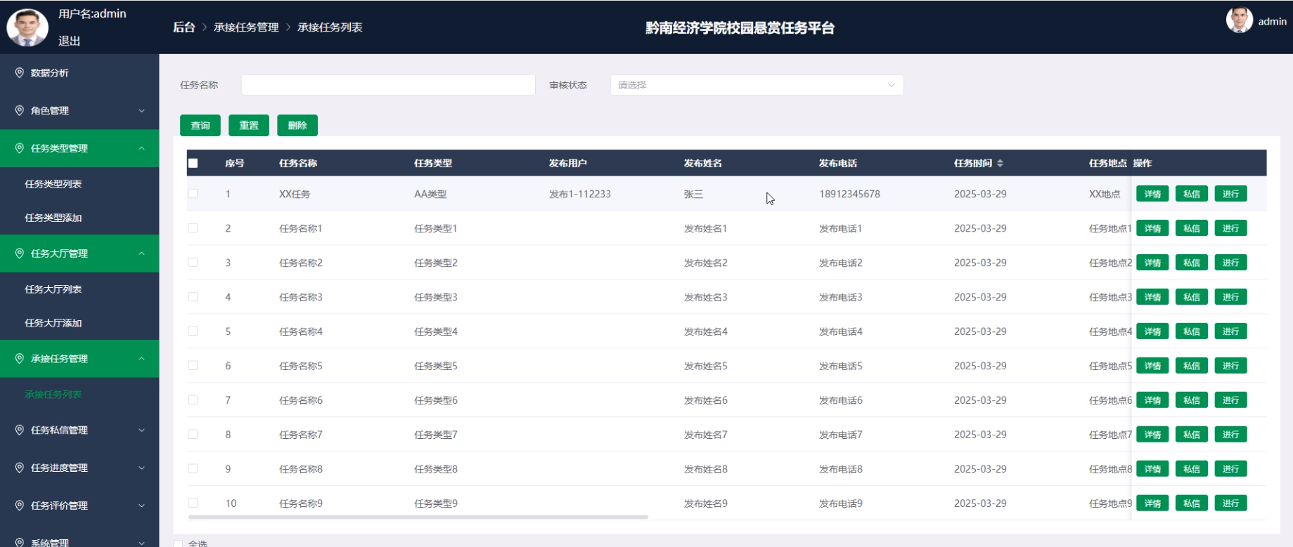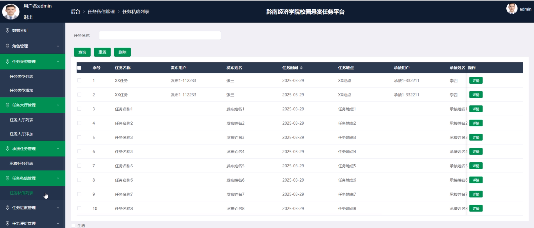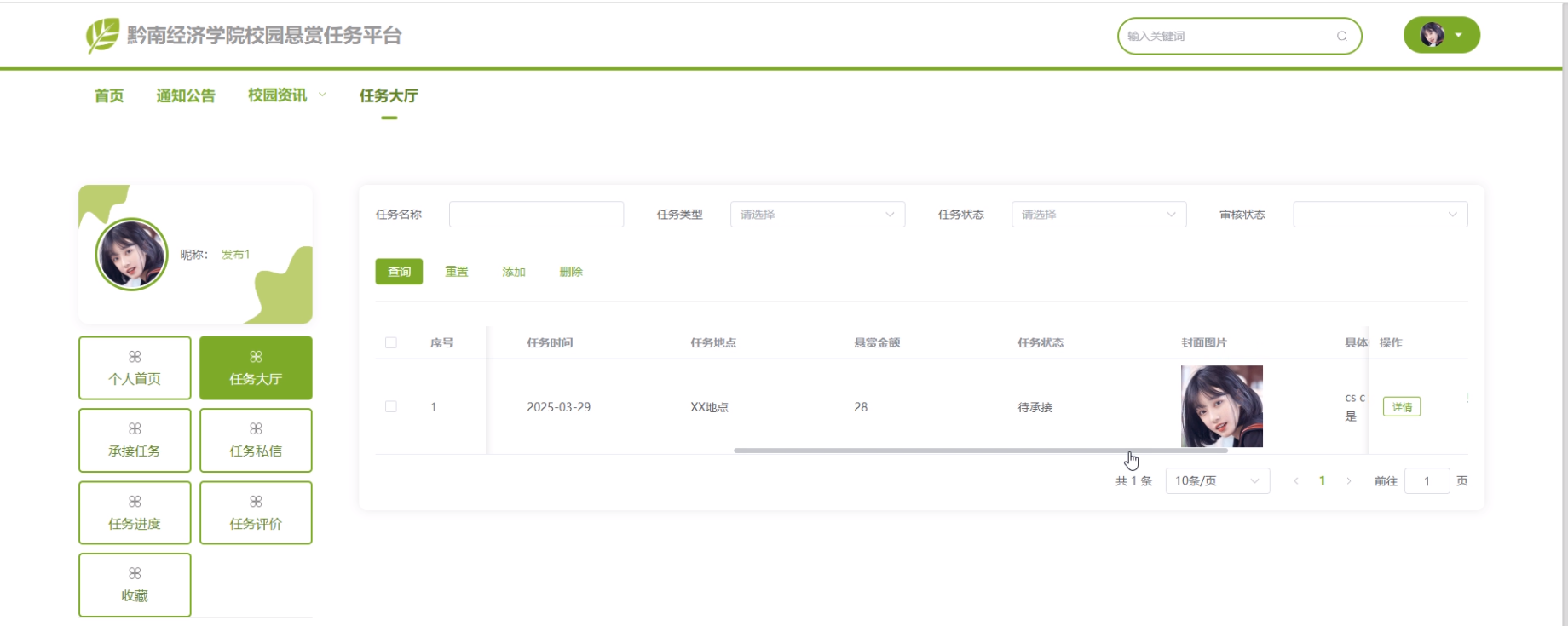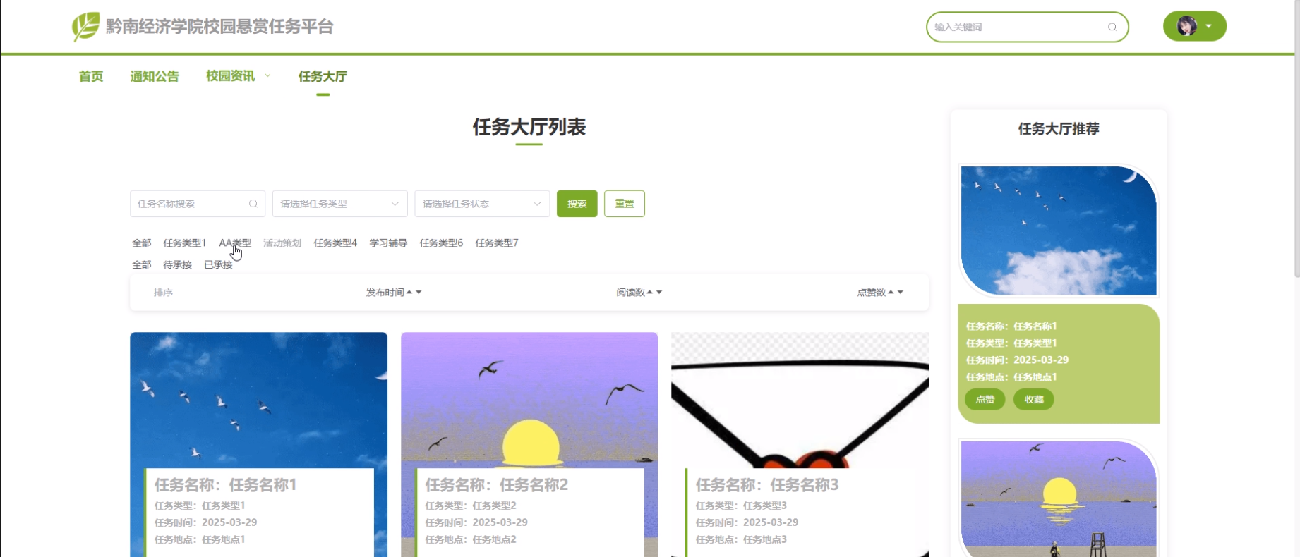 随着信息技术的迅速发展,校园内的信息交流和资源共享需求日益增长。传统的信息发布和任务分配方式已无法满足现代学生对于高效、便捷服务的需求。黔南经济学院校园悬赏任务平台旨在通过互联网技术,为学生提供一个集任务发布、承接、交流于一体的综合服务平台。这不仅能够有效促进校园内资源的合理配置,还能增强学生之间的互动与合作,提升校园生活的便利性和丰富性。