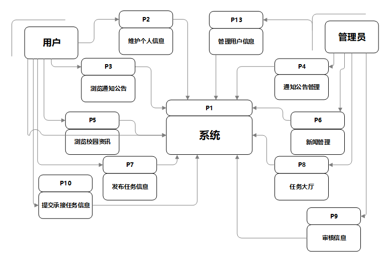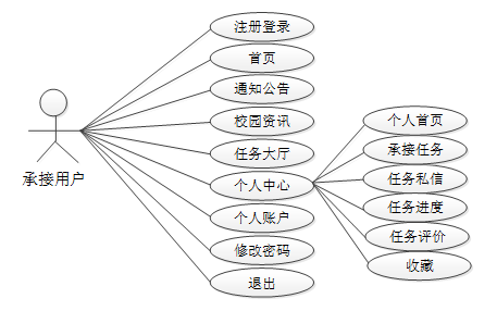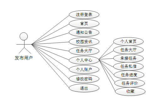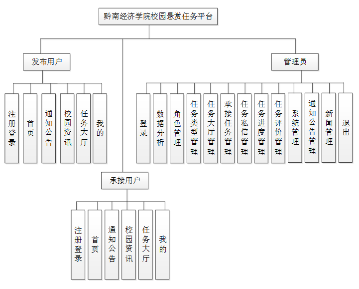 本系统分为发布用户、承接用户和管理员这两三用户模块,各用户模块的具体功能说明如下:
