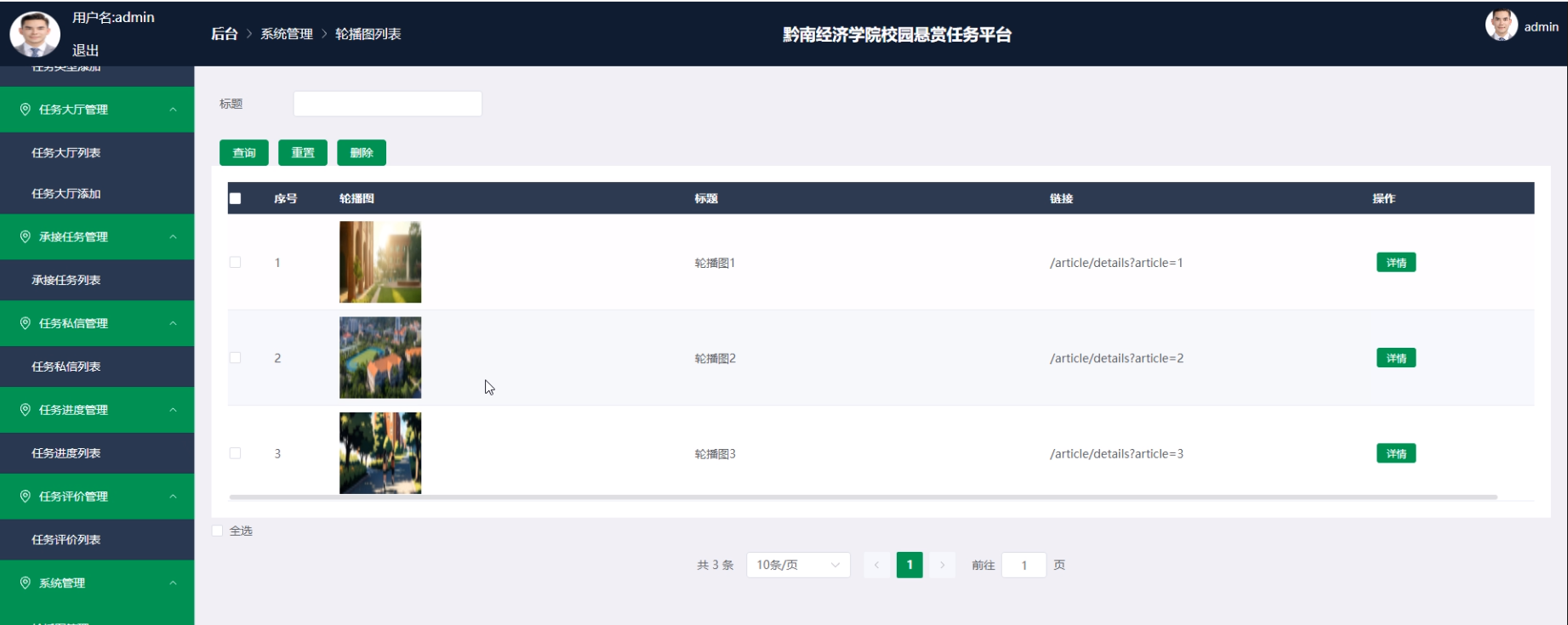 在该模块管理员可以对轮播图列表进行管理和进行轮播图添加。点击“轮播图列表”可以查看列表中某个轮播图的详情;点击“轮播图添加”进入页面上传轮播图和输入标题、链接信息后点击“提交”即可完成轮播图的添加。以轮播图列表为例,其界面如图5.14所示。