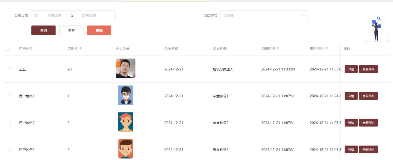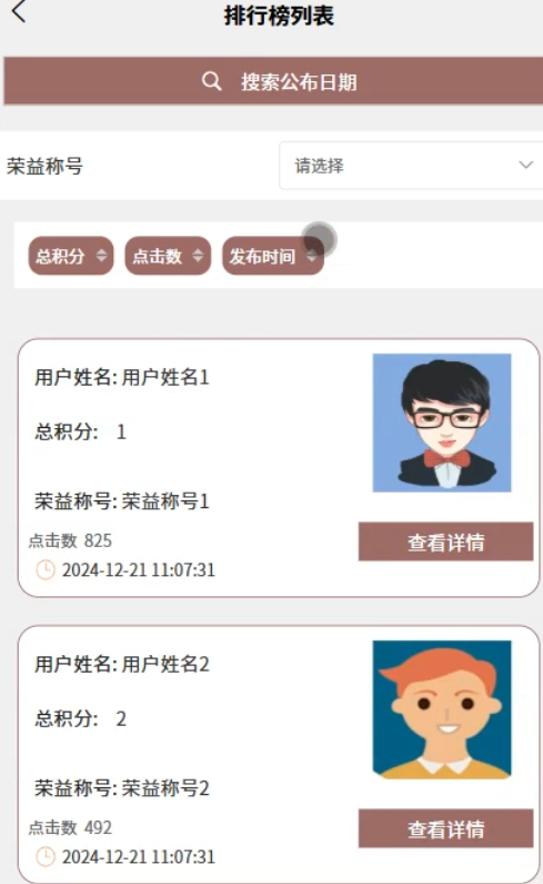 用户可以查看垃圾分类排行榜,并根据总积分、点击数、发布时间等条件进行排序。系统还支持按荣誉称号筛选用户,方便用户了解自己与他人的分类成绩。排行榜查看界面如图5-6所示。