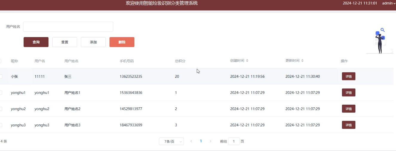 The system is divided into two parts: front-end and back-end. The front-end adopts modern web technology for interface design, while the back-end is developed based on Python language and Django framework. The database uses MySQL for data storage. Garbage recognition is implemented using CNN algorithm. The main functions of the system include garbage recognition, redemption center, viewing of delivery points, delivery registration, data statistics viewing, and ranking list viewing. Users can identify garbage types, view redeemed items, dispose of garbage, and accumulate points through the system. Administrators can manage users, delivery points, garbage classification information, exchange center items, exchange records, and other related content. The system provides an efficient, intelligent, and convenient solution for garbage classification management, which can improve the accuracy and user participation of garbage classification, and promote the in-depth development of garbage classification work.