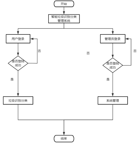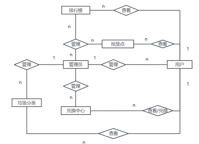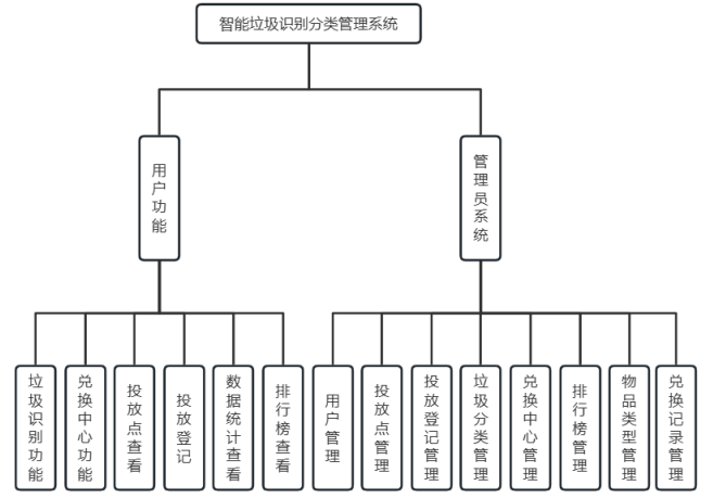 系统分为用户和管理员两大角色。用户可以进行垃圾识别、查看兑换中心物品、发表评论并用积分兑换物品。用户可以搜索并查看投放点信息,进行垃圾投放,查询和重置投放记录,进行投放登记并等待管理员审核。用户可查看个人垃圾分类统计图,了解投放情况,查询排行榜并按不同维度进行筛选。管理员负责管理用户账号信息、投放点信息、垃圾分类信息和兑换中心物品。管理员可以审核投放登记,发布积分,管理兑换记录、排行榜信息和物品类型信息。管理员还能够查看和处理用户提交的投放记录和相关数据。功能结构图如下图4-3所示。
