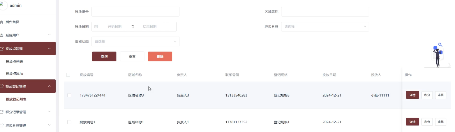 管理员可以管理投放登记记录,包括查询、重置、删除投放记录,并对投放登记进行审核。管理员审核通过后,投放记录会发布积分给用户。投放登记管理界面如图5-9所示。