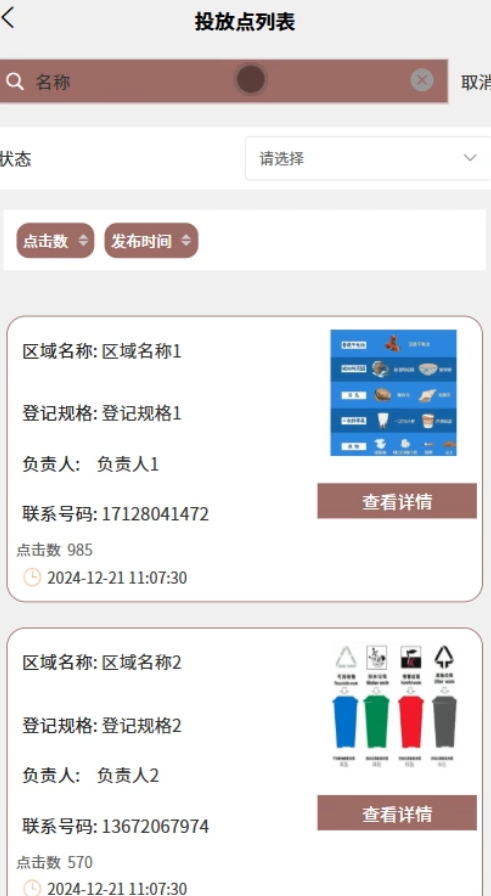 用户可以搜索并查看各个垃圾投放点的信息,系统提供了按状态、点击数和发布时间等多种筛选条件。用户可以选择符合自己需求的投放点并进行垃圾投放,系统会显示投放点的具体位置,方便用户选择合适的投放点。投放点查看界面如图5-3所示。