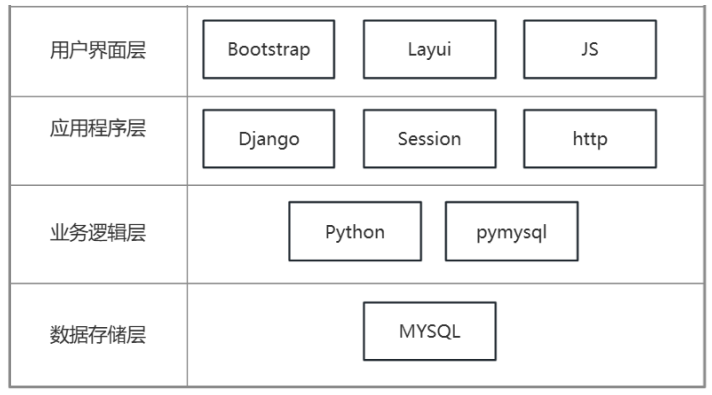 系统架构采用分层设计,分为用户界面层、应用程序层、业务逻辑层和数据存储层。用户界面层通过Bootstrap、Layui和JavaScript构建,提供响应式和交互性强的界面。Bootstrap提供了简洁、灵活的前端布局,支持不同设备的适配;Layui用于快速构建美观的UI组件;JavaScript实现动态交互和数据更新,增强用户体验。应用程序层使用Django框架实现,负责请求处理、业务逻辑的调度以及与数据存储层的交互。Django通过Session管理用户会话。HTTP协议用于客户端与服务器之间的数据传输。业务逻辑层采用Python编程语言,提供灵活的业务处理能力。Python作为系统的核心语言,完成数据处理、计算和逻辑实现。pymysql库用于与数据库进行连接和数据操作。数据存储层使用MySQL数据库进行数据存储和管理。MySQL提供强大的数据处理能力。系统中的数据都存储在MySQL数据库中。整个系统架构如图4-1所示。