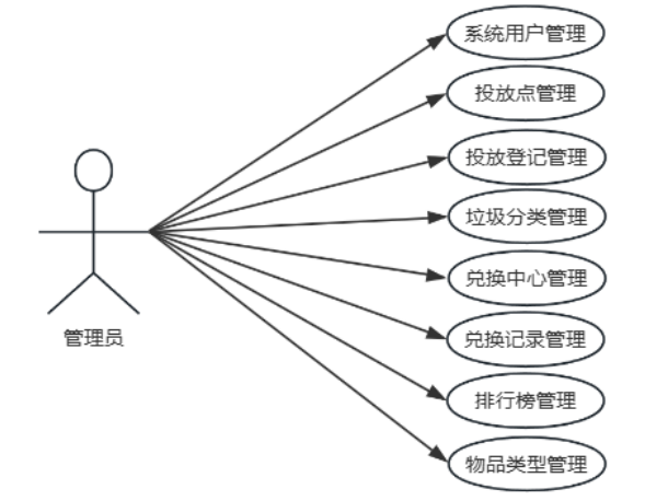 管理员可进行用户账号信息的增删查改,管理投放点的增删查改操作,审核投放登记并在审核通过后发布积分。管理员还可对垃圾分类信息、兑换中心物品信息以及物品类型信息进行增删查改。管理员能查询、重置、删除兑换记录,并管理排行榜用户信息。管理员功能用例图如图3-2所示。