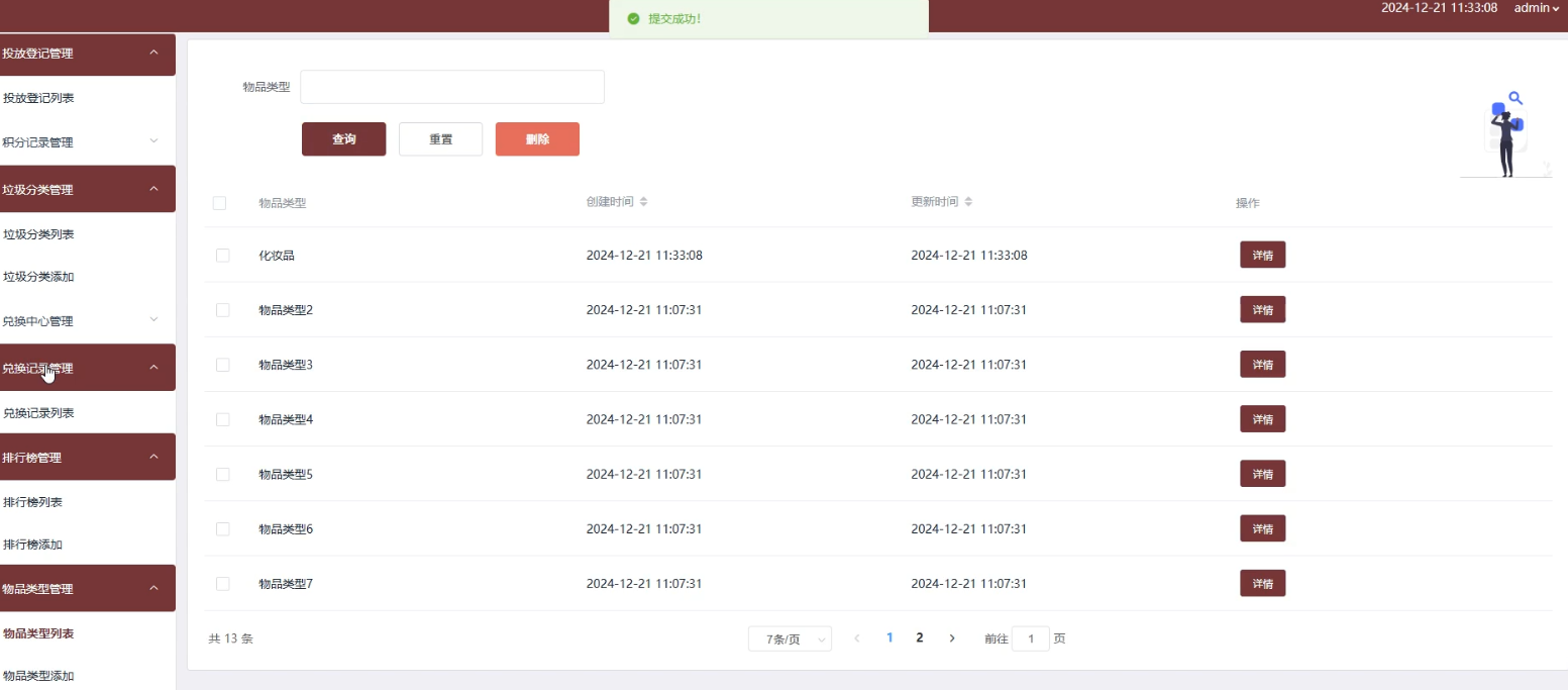管理员可以管理物品类型的信息,包括新增、删除和修改物品的类别。管理员通过管理物品类型来保持兑换中心物品的分类清晰,并优化物品的展示和兑换流程。物品类型管理界面如图5-14所示。
