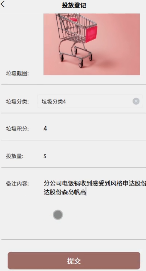 用户可以查询自己的垃圾投放记录,并进行重置或更新。投放登记需要用户填写相关信息并提交,提交后需等待,管理员审核通过,用户会获得相应的积分。投放登记界面如图5-4所示。