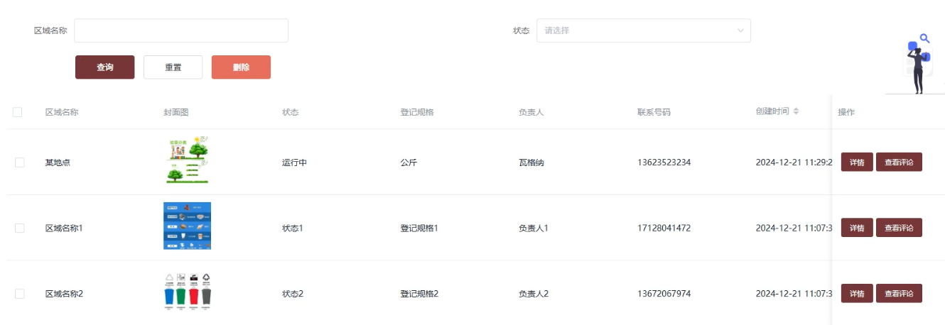管理员可以管理投放点的信息,包括增删查改投放点的位置、状态和详细说明。管理员可确保投放点数据准确,帮助用户找到合适的垃圾投放地点。投放点管理界面如图5-8所示。