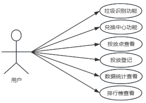 用户可以通过输入垃圾图像进行垃圾类型识别,系统输出该垃圾的类别。用户可以在兑换中心查看可兑换物品,进行评论并用积分兑换物品。能够搜索并查看投放点,进行垃圾投放。用户可查询和重置投放记录,进行投放登记,待管理员审核通过后可获得积分。用户可查看个人的垃圾分类统计图,统计自己投放的垃圾分类数量。还可以搜索并查看垃圾分类排行榜。用户功能用例图如图3-1所示。