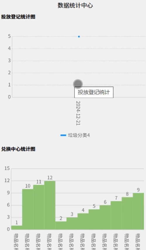 用户可以查看自己的垃圾分类统计图,系统会显示用户投放的垃圾数量以及各类垃圾的比例。数据统计查看界面如图5-5所示。