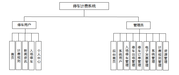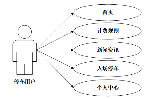 停车用户的功能包括首页、计费规则、新闻资讯、入场停车、个人中心(个人首页、入场停车、停车出场、停车订单、电子发票、收藏)。