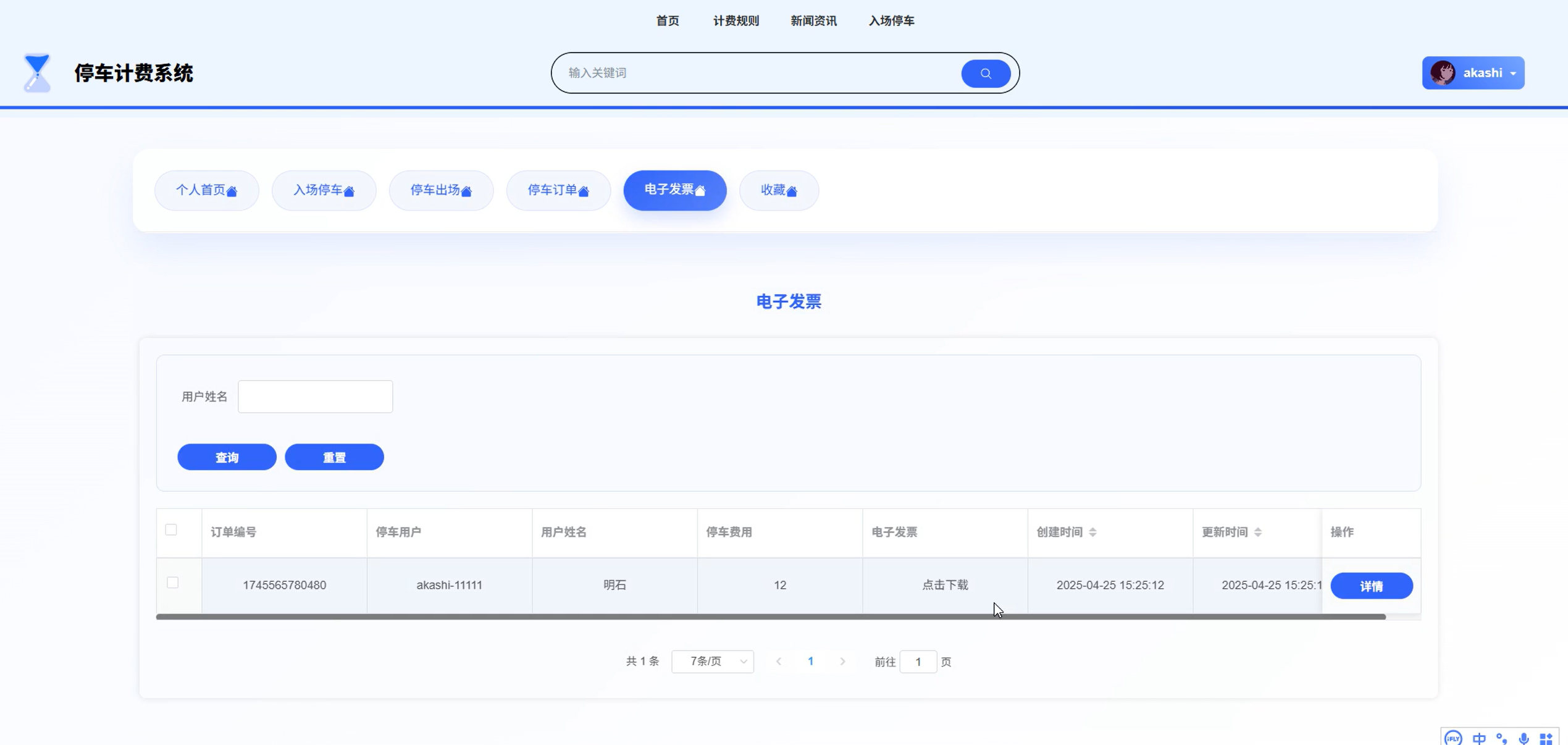 停车计费系统在解决城市停车管理问题方面取得了显著成效。系统通过合理划分停车用户和管理员的功能模块,实现了停车管理的自动化与智能化。停车用户可以便捷地查询计费规则、获取新闻资讯、进行入场停车操作,并在个人中心管理停车出场、查看停车订单、申请电子发票及进行收藏等操作。管理员则通过后台高效管理用户信息、停车流程、发票生成与资源分配,并通过iframe接入车牌识别技术,确保车辆信息的精准录入与管理。该系统显著提高了停车管理效率,缩短车辆进出时间,优化车位利用率,为缓解城市停车压力提供了有力的技术支持。经过实际应用验证,系统运行稳定,操作简便,有效提升了停车场的运营效率和用户体验,具有良好的实际应用价值与推广前景。