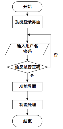 用户首先进入系统登录界面,输入用户名和密码后,系统验证信息是否正确。若验证失败,返回登录界面重新输入;若验证成功,则进入功能界面,执行相应功能处理后结束操作流程。操作流程如图3-5所示。