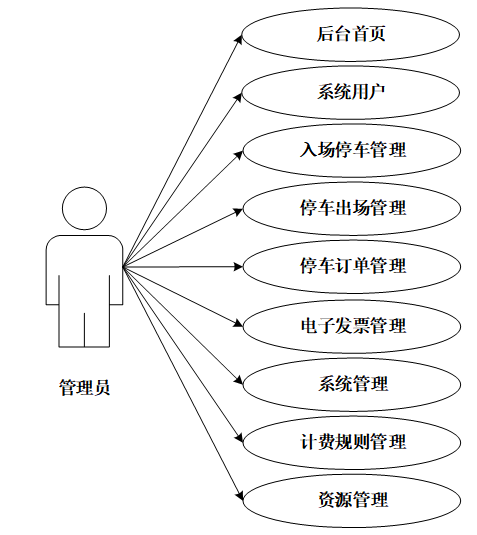 管理员的功能包括后台首页、系统用户(管理员、停车用户)、入场停车管理、停车出场管理、停车订单管理、电子发票管理、系统管理(轮播图管理)、计费规则管理、资源管理(新闻资讯、资讯分类)。