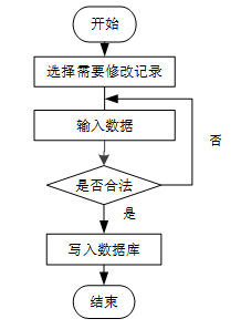 用户首先选择需要修改的记录,输入修改后的数据,系统判断输入数据是否合法。若数据不合法,提示重新输入;若数据合法,则将修改后的数据写入数据库,完成操作后流程结束。修改信息流程图如图3-7所示。