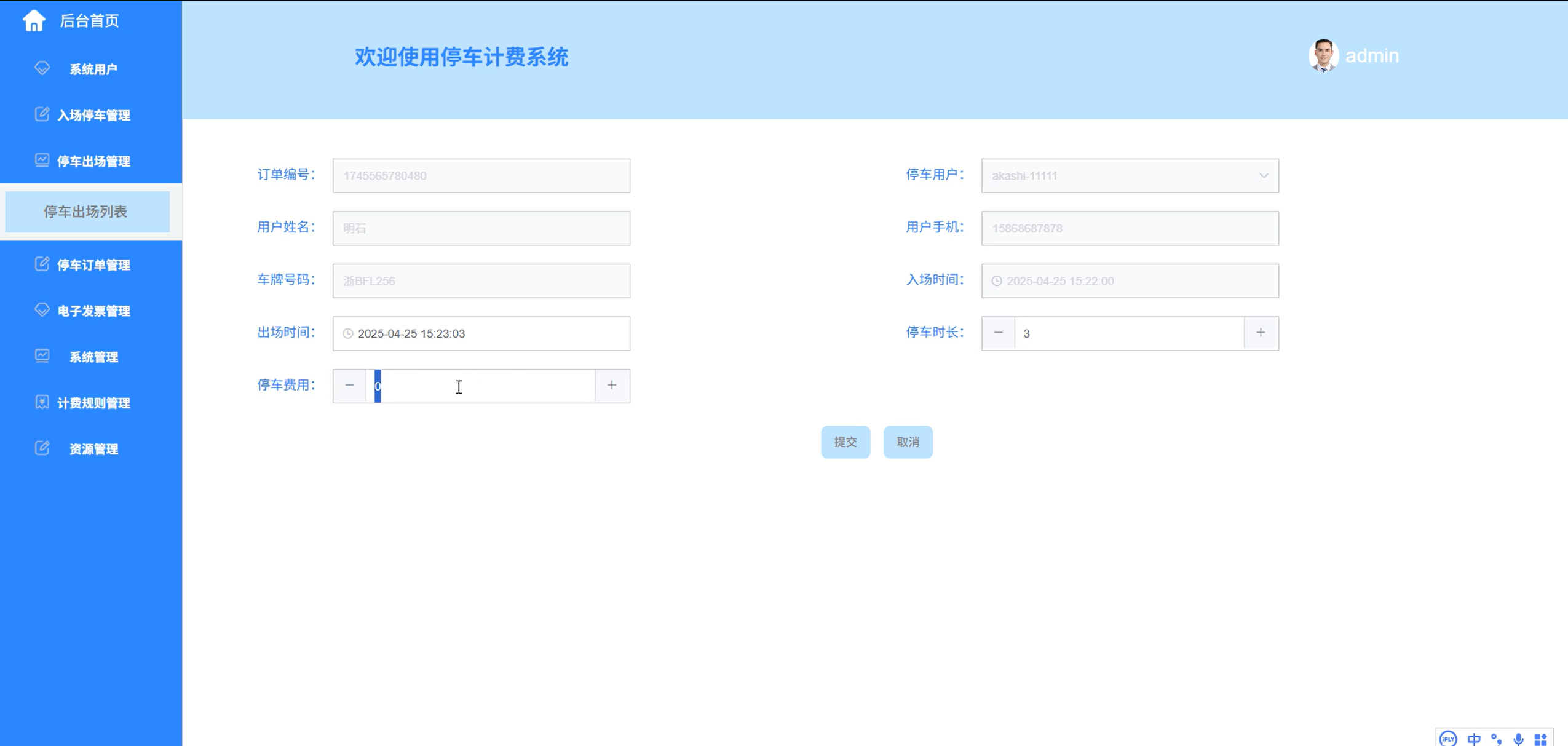 管理员登录停车场管理系统,对停车用户的费用进行结算。停车费用结算功能保障停车场营收数据准确,为财务核算提供依据。停车费用结算界面如图5-5所示。