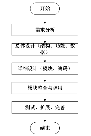 系统开发流程的主要步骤,从需求分析到系统完成的全过程。流程包括需求分析、总体设计(结构、功能、数据)、详细设计(模块、编码)、模块整合与调用,以及测试、扩展和完善,最终完成系统的开发。本系统的开发流程如图3-3所示。