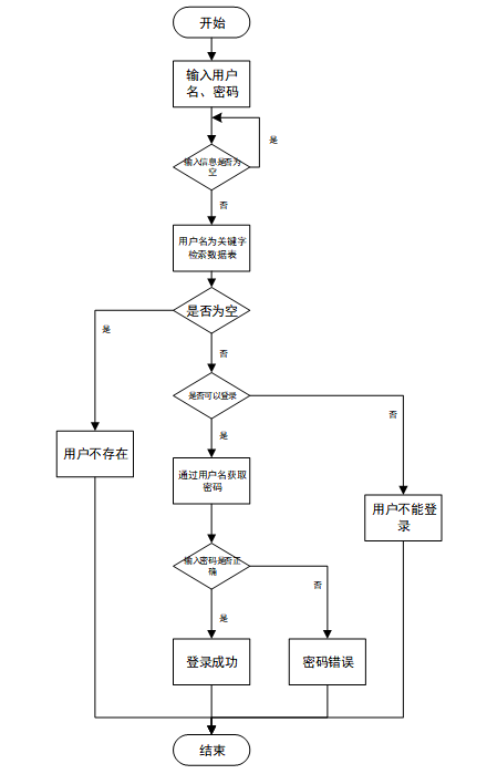 用户输入用户名和密码后,系统先检查输入是否为空,再验证用户名是否存在,若存在则通过用户名获取密码并校验。若密码正确则登录成功,否则提示密码错误。若用户名不存在或无法登录,提示用户操作无效。如图3-4所示。