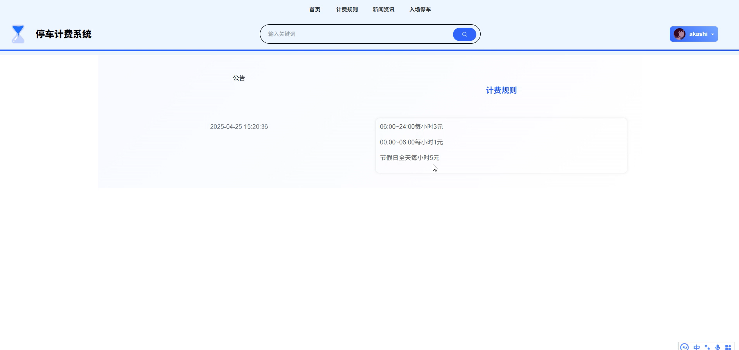 随着城市化进程的加快,城市停车问题日益突出,传统的人工停车管理方式不仅效率低下,还容易出现错漏。为应对这一挑战,本研究基于 JavaScript 技术,引入 Spring Boot 框架,设计并开发了一套停车计费系统,以实现停车管理的自动化与智能化。该系统涵盖停车用户和管理员两大角色,针对停车用户,提供包括首页展示、计费规则查询、新闻资讯浏览、入场停车操作以及个人中心管理在内的便捷服务;对于管理员,则设有后台首页,支持系统用户管理,以及入场停车、停车出场、停车订单、电子发票的全流程管理,同时具备系统管理、计费规则制定与调整、资源管理等功能,并通过 iframe 实现车牌识别接入,确保车辆信息的准确获取。在系统设计与开发过程中,深入分析了停车管理业务流程与需求,运用 JavaScript 实现前端交互,借助 Spring Boot 框架搭建后端服务,以实现前后端分离的架构设计。系统经测试运行稳定,操作简便,能够有效提升停车管理效率,缩短车辆进出时间,提高车位利用率,为缓解城市停车难题提供了有力的技术支持。